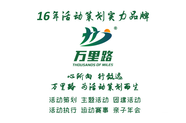 萬里路活動策劃是一家致力于主題活動、團建活動、運動賽事、軍事培訓、年會策劃、親子夏令營、徒步旅行、定制服務(會務會展執行、廣告設計制作、舞美燈光搭建、攝影攝像剪輯) 素質教育(研學活動、社會實踐、勞動教育)為一體的大型公司。16年活動策劃實力品牌一萬里路2009成立,2015年通過國家商標局注冊,經過多年的發展,已成為中國活動策劃領域的領跑者,目前是華東區域執行團隊經驗豐富,品牌過硬策劃資深的活動策劃公司,公司先后獲得安徽武漢商會理事單位,安徽省拓展行業促進會理事單位,武漢安慶商會會員單位,武漢最佳品牌戶外拓展培訓機構,湖北十佳拓展培訓公司,全國體驗教育培訓論壇十佳培訓師,全國影響力企業,仟吉集團指定體驗拓展培訓師,樂博樂博機器人指定體驗拓展培訓供應商,安徽拓展行業促進會常務會長,等榮譽。我們意在通過不斷創新不斷進取、不斷開拓的經營思路為您企業活動保駕護航!同時,萬里路秉承工匠心態,用專注、專業、專心、專一經營理念為您企業活動提供高品質的服務! 萬里路活動策劃,16年沉淀只為尊貴您!