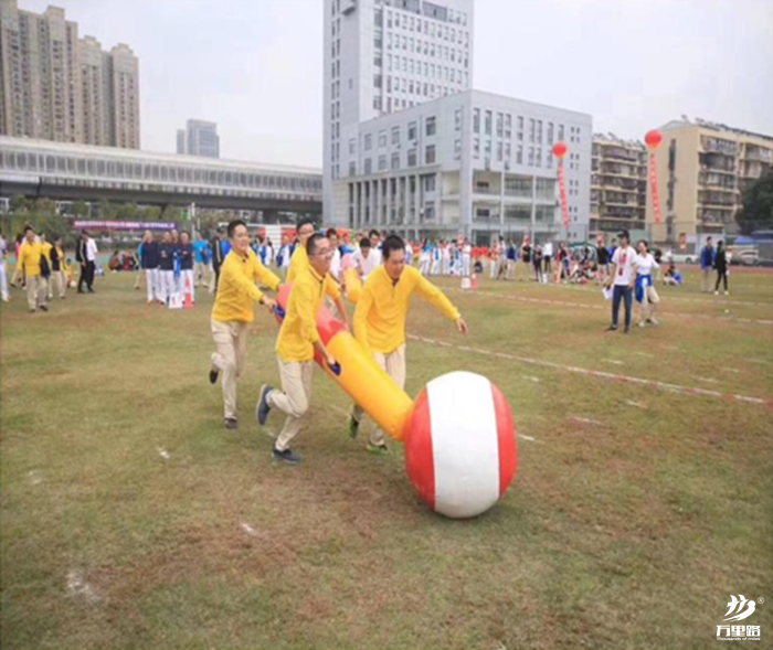 【比賽方法】四人通過用充氣棍一起把球推到30米處的終點,用時最短的隊獲勝。
